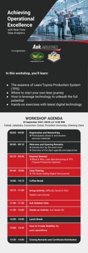 Join us for an intensive workshop designed to streamline your processes and boost efficiency through Lean Manufacturing principles.   📅 Date: Wednesday, 25 September 2024 🕒 Time: 08:00 WIB - finished 📍 Location: Fablab Jababeka   In this workshop, you’...
